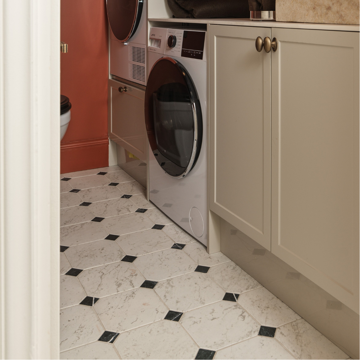 The laundry is often overlooked in home design, but Emily saw it as an opportunity to combine functionality with style. The Como Nero Dot tiles bring depth and drama to this hardworking space, turning it into a room you actually enjoy being in.