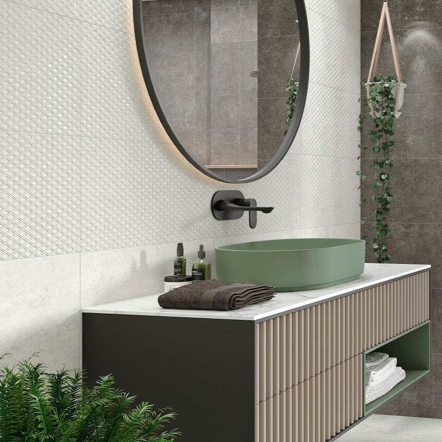 Our Ascot Moon collection is an easy way to add a contemporary, cosmopolitan style to your bathroom. Featuring a unique, industrial-inspired cement surface and diamond-shaped decoration tile, this elegant collection will add sophistication and character to your space. Available in three colourways: Moon, Pearl, and Shadow, and a matching Porcelain floor tile, Ascot Moon is the perfect choice for your renovation.